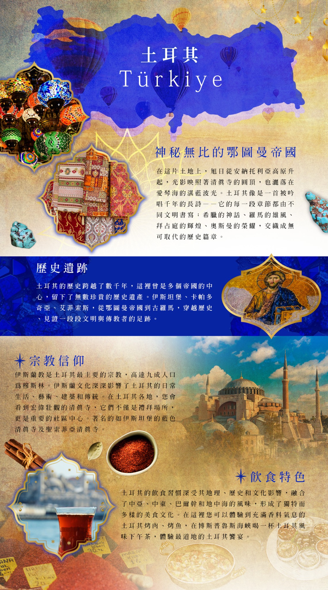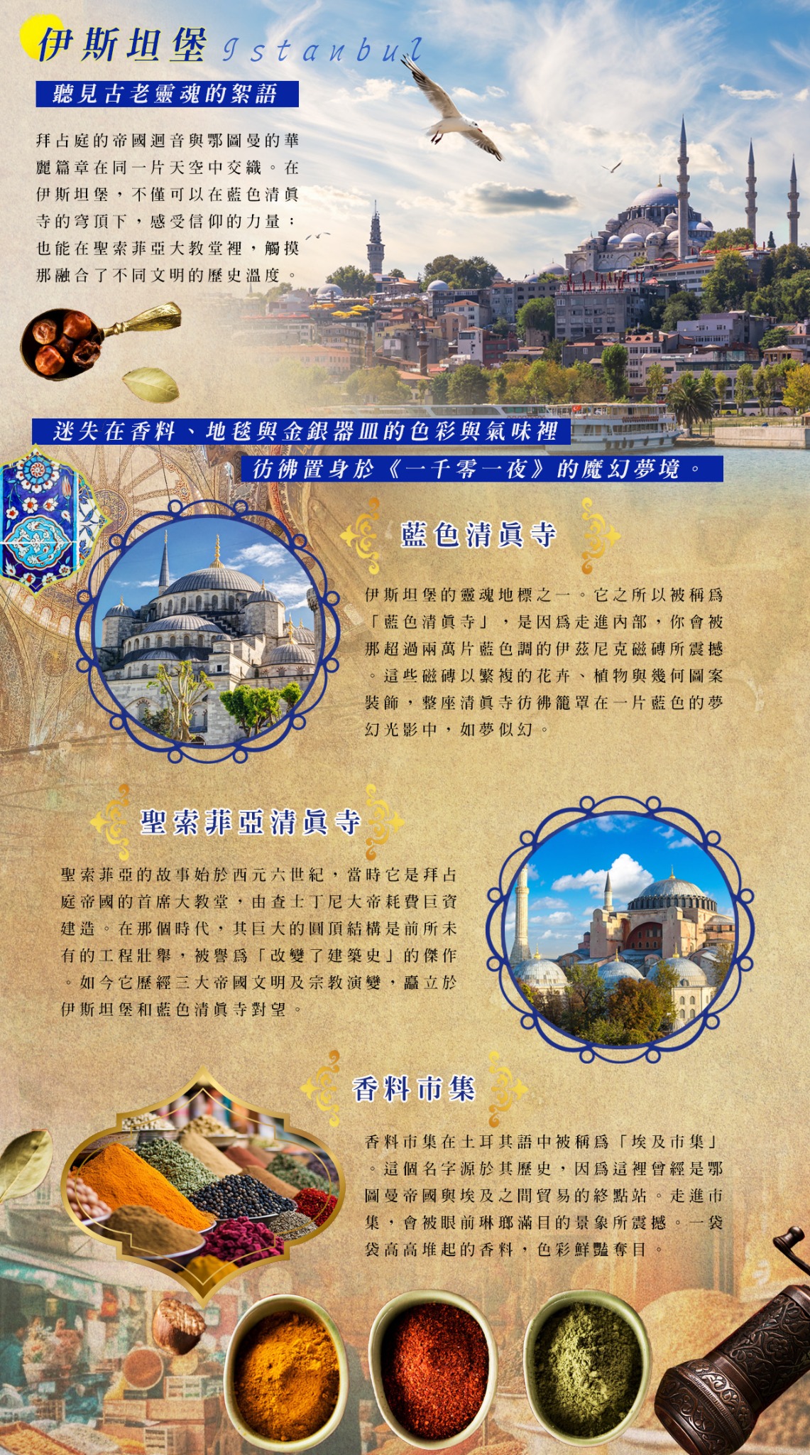 今日集合於桃園國際機場,踏上探索歐亞古文明之旅。搭乘全球最佳航空公司之土耳其航空班機,直飛往嚮往已久的~伊斯坦堡。