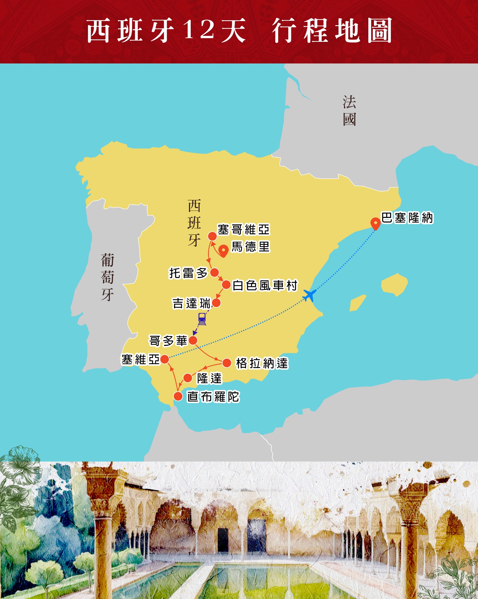 2.阿罕布拉宮更新團體預訂規則,嚴格把關每日進場人數及開放購票時間。若遇當天預約已滿、無法接受預訂則改安排參觀【格拉納達皇室禮拜堂】或【阿爾罕布拉皇宮花園】,不便之處懇請貴賓諒解。